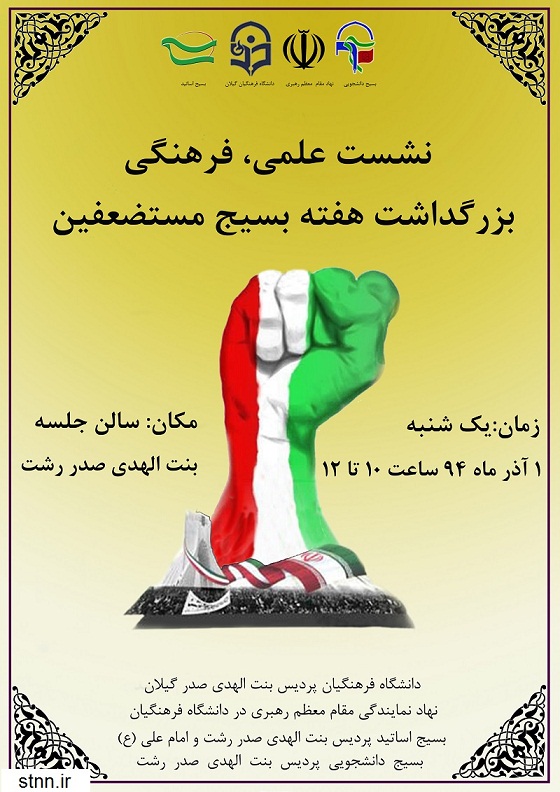 به مناسبت هفته بسیج، نشست علمی، فرهنگی بزرگداشت هفته بسیج مستتضعفین یک شنبه 1 آذر ماه 94 ساعت 10 تا 12 در سالن جلسه پردیس بنت الهدی صدر رشت توسط نهاد مقام معظم رهبری، بسیج اساتید بنت الهدی صدر و امام علی (ع) و بسیج دانشجویی پردیس بنت الهدی صدر رشت برگزار می گردد. از کلیه دانشجویان و اساتید جهت شرکت در نشست دعوت بعمل می آید.