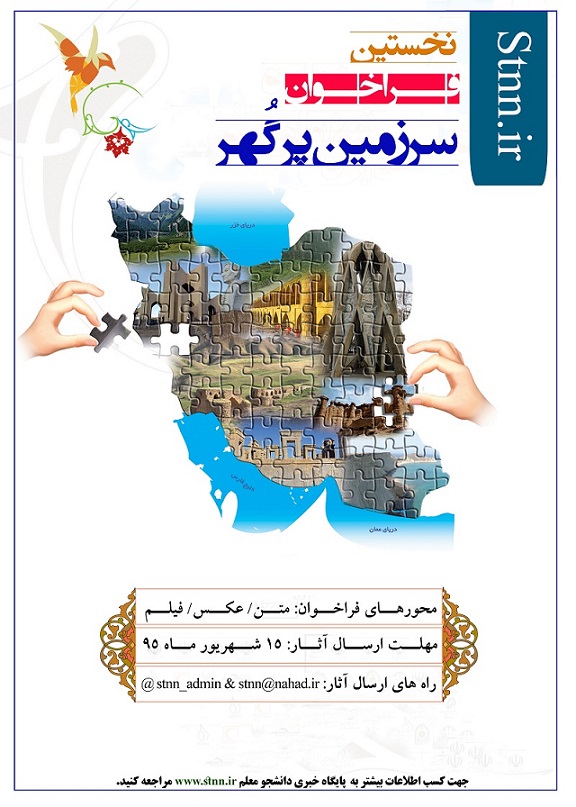 پایگاه خبری دانشجو معلم (stnn) در راستای آشنایی دانشجو معلمان با انواع اقلیم ها، فرهنگ ها و یا محیط های طبیعی نقاط مختلف کشور پهناور ایران برآن شد تا نخستین فراخوان "سرزمین پرگهر" را با شرکت مخاطبان پایگاه خبری در این زمینه برگزار کند. دانشجومعلمان علاقمند به شرکت در این فراخوان، می توانند آثار خود را با محتوای توضیح مختصر نقاط گردشگری و محیط زندگی خود، به همراه عکس یا فیلم ارسال کنند.