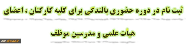 امتیاز دهید : ثبت نام در دوره حضوری بالندگی برای کلیه کارکنان ، اعضای هیأت علمی و مدرسین موظف 2 شنبه 5 تیر 1395 ساعت 14:29