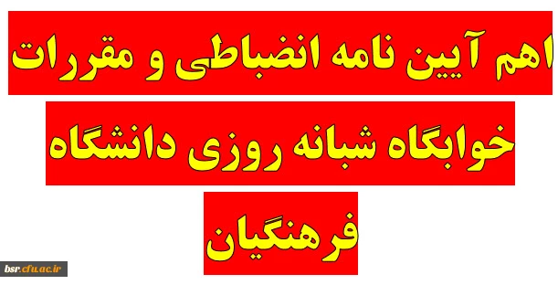 امتیاز دهید : اهم آیین نامه انضباطی و مقررات خوابگاه شبانه روزی دانشگاه فرهنگیان 2 شنبه 3 مهر 1395 ساعت 9:02