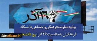 امتیاز دهید : بیانیه معاونت فرهنگی و اجتماعی دانشگاه فرهنگیان به مناسبت 16 آذر 1397 2 شنبه 17 آذر 1397 ساعت 8:34