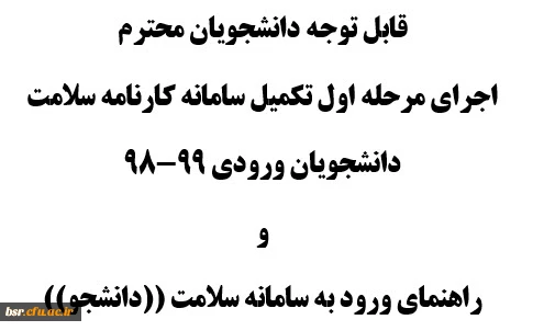 قابل توجه دانشجویان محترم اجرای مرحله اول تکمیل سامانه کارنامه سلامت دانشجویان ورودی 99-98 و راهنمای ورود به سامانه سلامت ((دانشجو)) 2