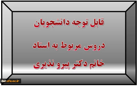 امتیاز دهید : قابل توجه دانشجویان دروس مربوط به استاد خانم دکتر پیرو نذیری 2 یکشنبه 25 اسفند 1398 ساعت 10:00