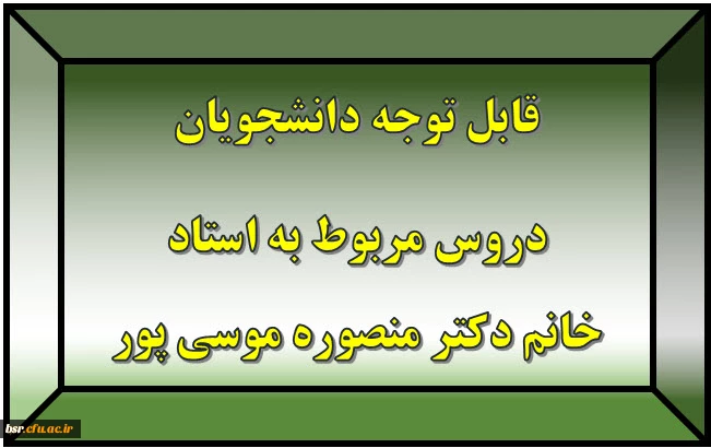امتیاز دهید : قابل توجه دانشجویان دروس مربوط به استاد خانم دکتر منصوره موسی پور 2 یکشنبه 10 فروردین 1399 ساعت 17:12
