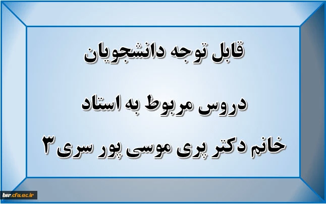 امتیاز دهید : قابل توجه دانشجویان دروس مربوط به استاد خانم دکتر پری موسی پور سری3 2 یکشنبه 24 فروردین 1399 ساعت 12:45