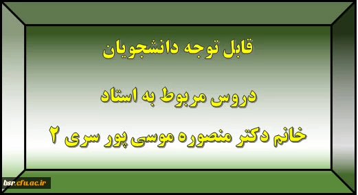 امتیاز دهید : قابل توجه دانشجویان دروس مربوط به استاد خانم دکتر منصوره موسی پور سری 2 2 دوشنبه 1 اردیبهشت 1399 ساعت 9:50