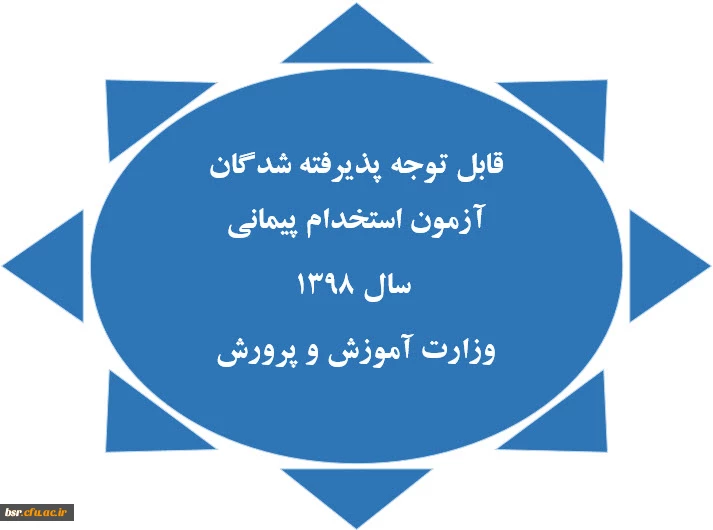 امتیاز دهید : قابل توجه پذیرفته شدگان آزمون استخدام پیمانی سال 1398 وزارت آموزش و پرورش 2 دوشنبه 8 اردیبهشت 1399 ساعت 14:18