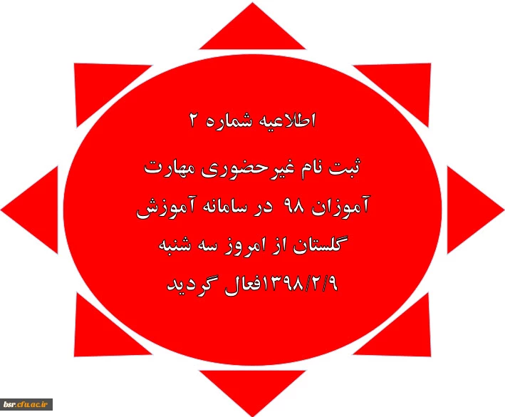 اطلاعیه شماره 2 ثبت نام غیرحضوری مهارت آموزان ٩٨ در سامانه آموزش گلستان از امروز سه شنبه ٩/٢/١٣٩٨فعال گردید 2